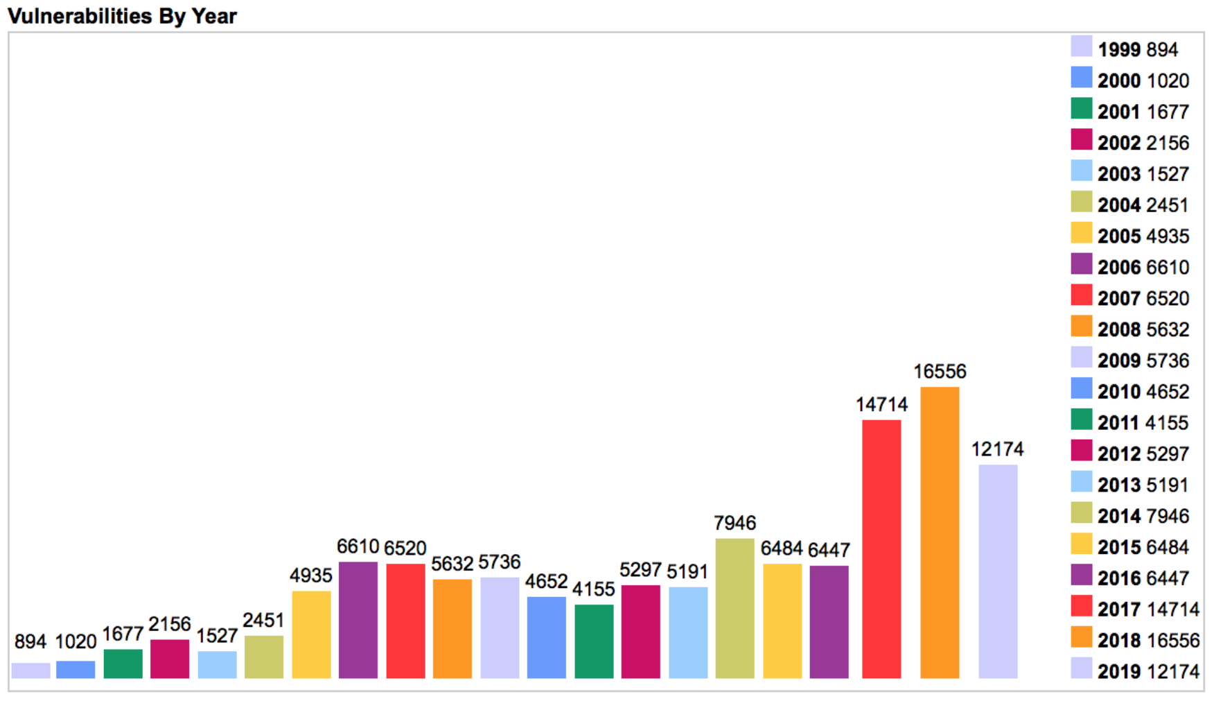 To illustrate the impact, see the above chart. After setting a record of 16,556 in 2018, the number of reported CVEs in 2019 was on pace to set yet another record. The most recent information available reflects the first nine months of 2019, which includes 12,174 new CVEs discovered.