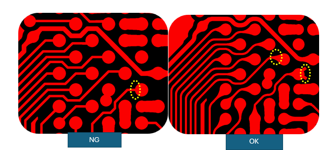 When transitioning traces to pads that contain plated vias, teardrop shapes help reduce stress and improve mechanical reliability. Anchor stubs on pads in flex regions can prevent pad lifting under flex stress.