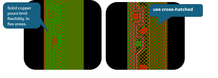 Solid copper pours limit flexibility. In flex areas, use cross-hatched ground planes to maintain EMI shielding while preserving bendability. Just ensure continuity and signal return paths are not compromised.