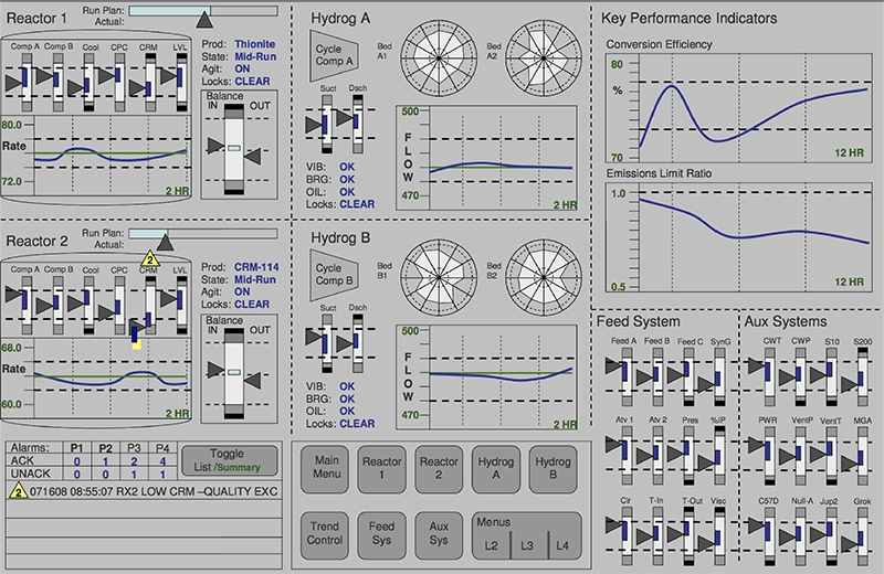 The users of your HMI will need to be able to do two things: view content and navigate to content they want to find. On a large screen HMI best practice is to minimise the number of physical screens to simplify navigation. An example of a well designed HMI on a large screen might looks like this. The content is well organised and all of the summary information is immediately visible. Each of these views can be further expanded following a hierarchical navigation structure.