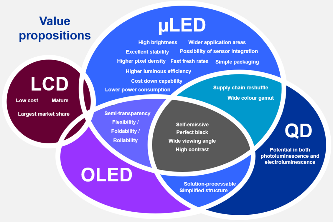 Each technology has its marketing features to attract end-users but from the graph shown below, some of the value propositions can be provided by alternatives such as LCD, OLED and QD, not Micro-LED only. There are some value propositions unique for Micro-LED displays.