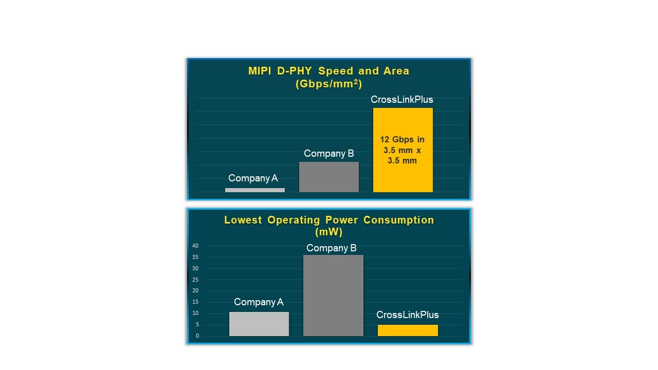 From a competitive standpoint, the device delivers the fastest-in-class hardened MIPI D-PHY speed per unit area. In a comparison of similar devices from industry competitors, Lattice’s CrossLinkPlus offers better D-PHY performance in a smaller footprint than competitors and lower power consumption.