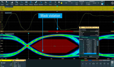Users can carry out further detailed analyses once the eye diagram is displayed. Along with simple cursor measurements, the oscilloscope has a broad range of automated eye diagram measurements. Eye mask testing is another important function. Signals passing through a mask are registered as violations. The oscilloscope provides predefined masks for many standards. But users can also quickly create other masks, either directly on the screen or using specific settings in the mask dialogue. The eye stripe function marks a violation of the eye mask as a red stripe at the corresponding time point in the original waveform. This makes it easier to identify the causes of mask violations.