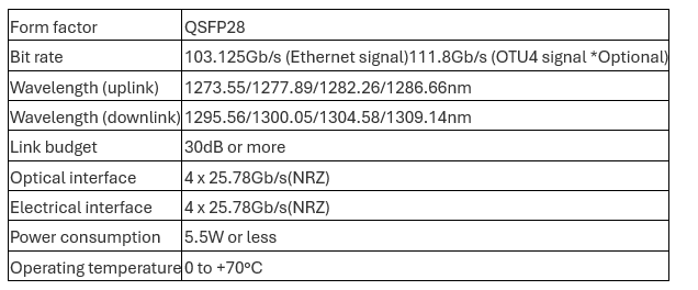 The electrical interface is the same as that of conventional 100G QSFP28 products, and it meets a specification of 5.5W or less power consumption, so it can be easily introduced into existing QSFP28 ports. In addition, because it uses a direct detection method, it achieves low latency and low cost compared to coherent methods.