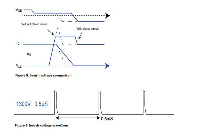• In high power/high current applications, high voltage inrush may occur at IGBT terminal C and terminal E when the device is turning off.