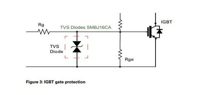 However, if there is no implementation of the TVS Diodes at the IGBT collector to gate during a turn-off event, the turnoff of the VGE will cause a sudden rise of voltage across the collector and gate to an even higher level, which will cause IGBT failure.