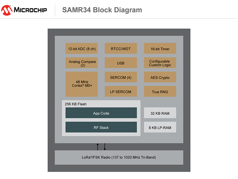 Most LoRa end devices remain in sleep mode for extended periods of time, only waking occasionally to transmit small data packets. Powered by the ultra-low-power SAM L21 Arm Cortex-M0+ based MCU, the SAM R34 devices provide sleep modes as low as 790nA to significantly reduce power consumption and extend battery life in end applications. Highly integrated in a compact six by six millimetre package, the SAM R34/35 family is ideal for a broad array of long-range, low-power IoT applications that require small form factor designs and multiple years of battery life.