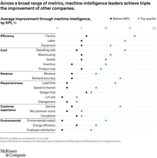 Various studies have shown how AI and ML can add value to your processes. McKinsey explains how companies that use Machine Intelligence (MI) achieve three to four times the impact of their peers: