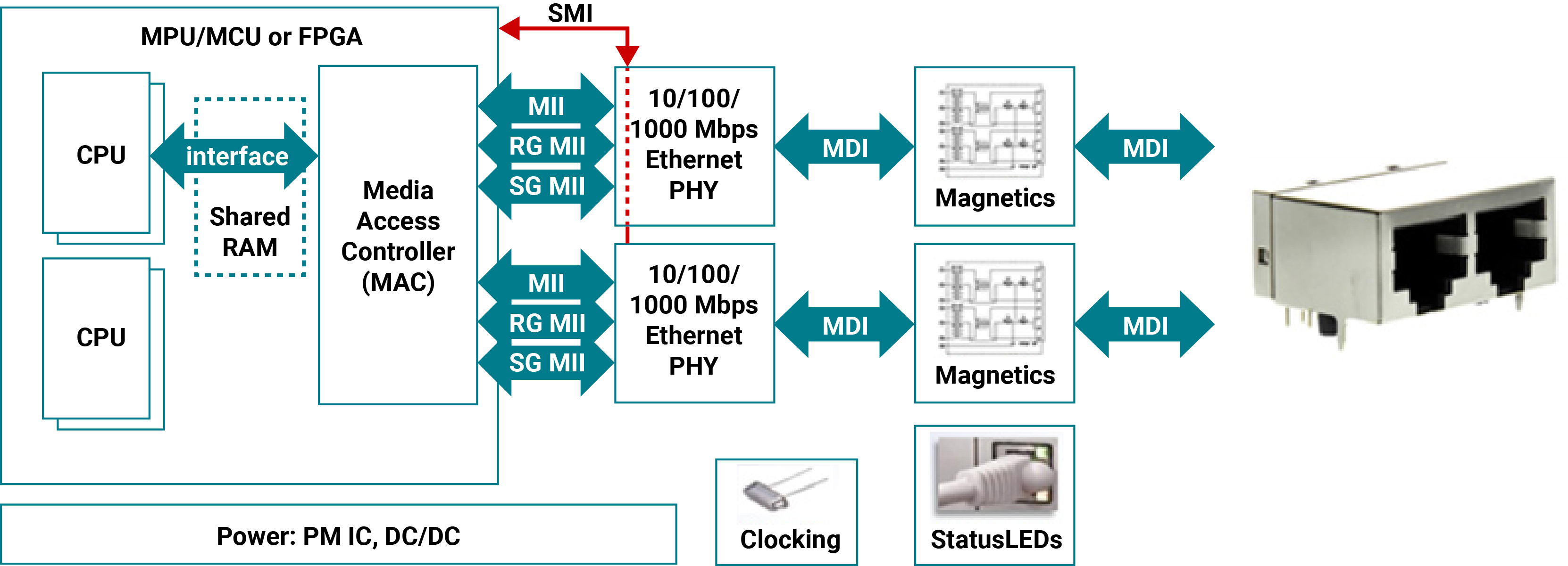 From the RJ45 connector, the Medium Dependent Interface (MDI) connects to magnetics that provide an isolation barrier to other devices before the Ethernet frame enters the Ethernet physical layer (PHY) transceiver.