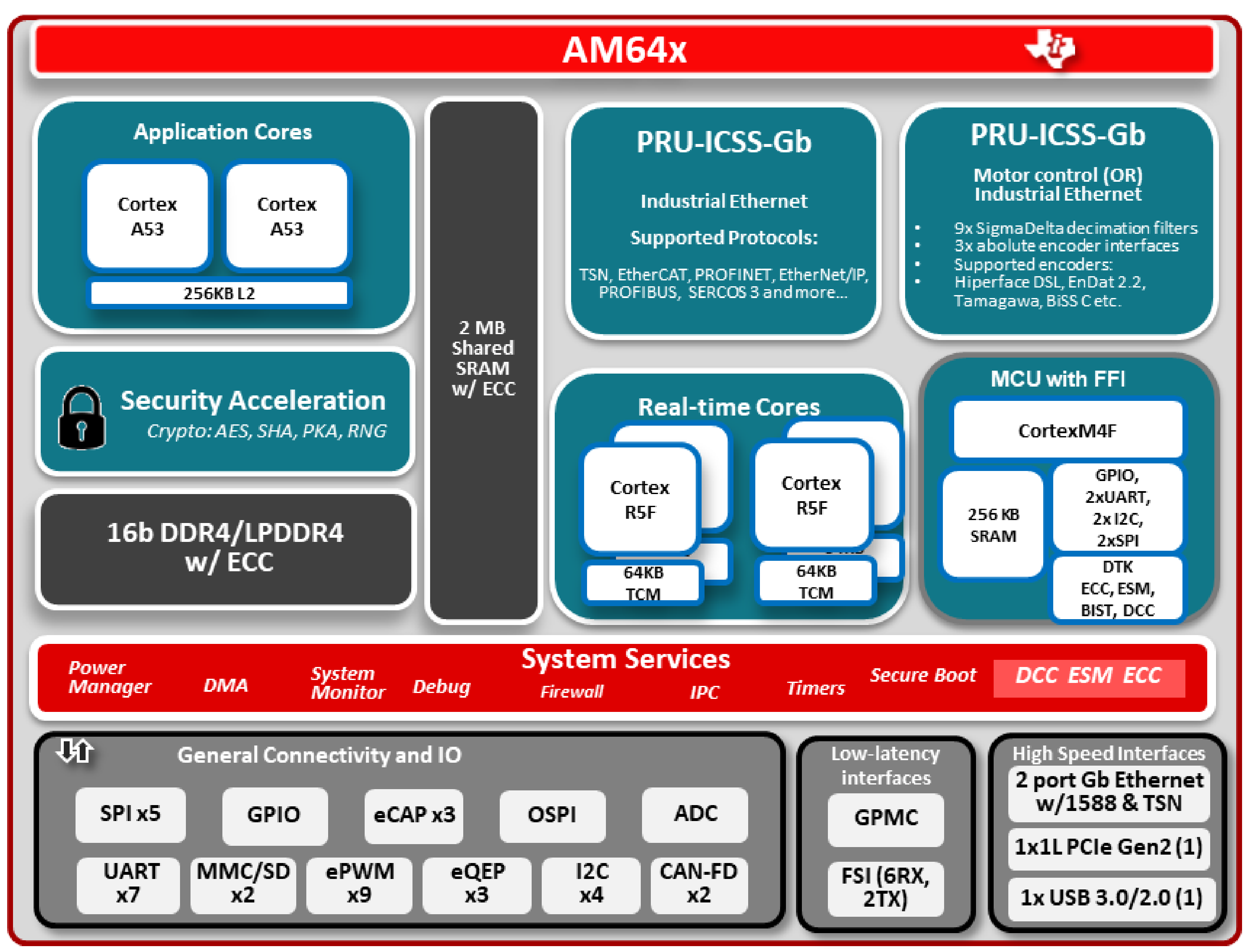 Sitara processors also integrate various functions used by industrial applications, including ADC, SPI, I2C, and general-purpose memory controllers. The system-on-chip also has internal shared memory to exchange process data between the MAC and CPU.