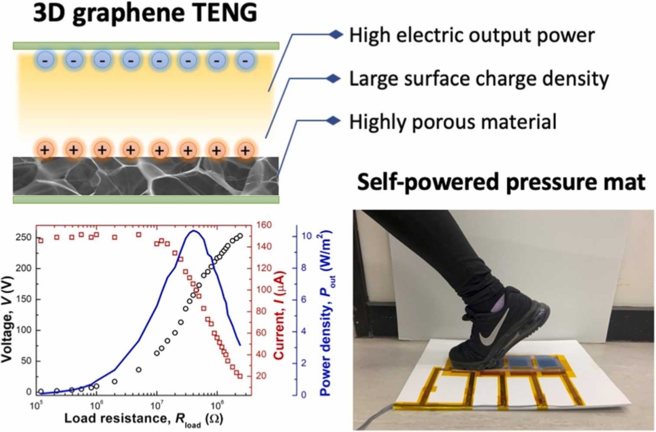 However, efforts to develop a commercially viable TENG have, to date, been hampered by issues relating to low durability, limited energy output and inefficiency. The addition of Gii to TENG has opened up a whole new world of possibilities due to its unique properties including high surface area, porosity, light weight, and superior electrical properties. The energy autonomous, pressure sensing nature of Gii-TENG has the potential to transform various aspects of our lifestyles, society and economy including, for example: