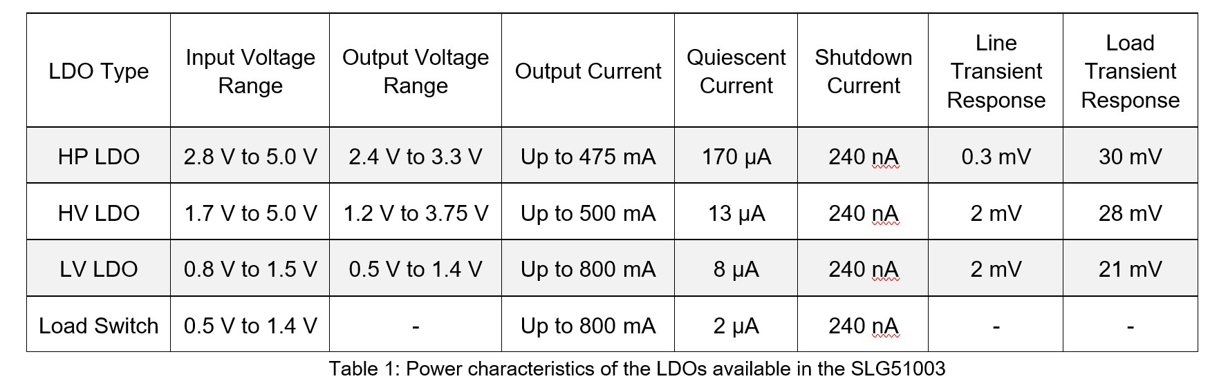 Different types of LDOs are available in each SLG5100X device, each type with different characteristics and excelling in specific applications:
