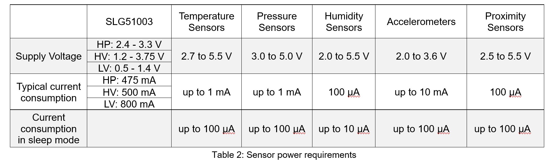 As can be seen from the table, SLG5100X integrated LDOs are compatible with the power requirements for different sensors used in common IoT applications.