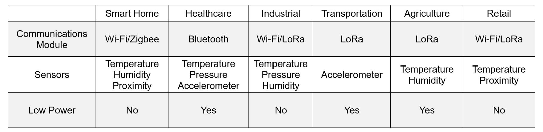 Communications modules and peripherals will vary depending on the application. Table 4 shows the typical components that may be used as building blocks in most common IoT applications (as shown in Figure 1).