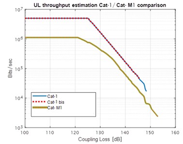 As shown in the graphic below, CAT-1 and CAT-1bis transfer more bits per second in good conditions. However, as conditions deteriorate and coupling loss increases, CAT-1’s bit rate drops and becomes closer to LTE-M. CAT-1bis completely disconnects at around 145 dB MCL (minimum coupling loss), and CAT-1 loses its connection at about 149 dB. LTE-M, on the other hand, is able to maintain its connection down to 154 dB CL.