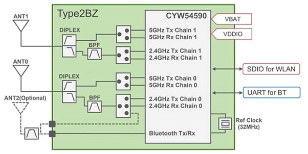 Figure 2. The Type 2BZ module is based on the CYW54590 Wi-Fi 5 and Bluetooth 5.1 combo SoC with onboard PAs and LNAs. (Image source: Infineon Technologies)