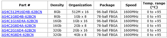 Samples and production quantities of the AS4C512M16D4B-62BCN, AS4C1G8D4B-62BCN, AS4C1G16D4A-62BCN, AS4C2G8D4A-62BCN, AS4C2G16D4-62BCN, and AS4C4G8D4-62BCN are available now, with lead times of four weeks.