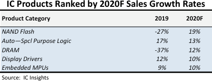 The 2020 NAND flash market is expected to rise by 19%, a solid follow-up to the 27% decline in 2019. Similarly, the 12% gain forecast for the DRAM market is a strong turnaround from 2019, when it demonstrated the poorest growth among all 33 IC product categories.