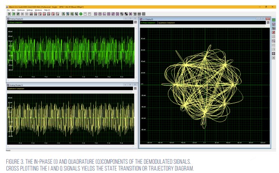 The acquired RF carrier was demodulated externally to SBench 6, using proprietary vector signal analysis software, and then the resultant in-phase and quadrature components are re-imported back into SBench 6 for additional analysis and display. Figure 3 provides an example of the results. The I component is shown in the upper left trace, the Q component is shown below the I component.