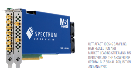 The one-channel M5i.3350-x16 and the two-channel M5i.3357-x16 feature front end circuitry with over 3GHz bandwidth and up to 16GB (8 GSamples) on-board memory. They also reach the fastest digitiser data transfer speeds, over PCIe, on the market. Using 16 lane, Gen 3, PCIe technology, data can be streamed over the bus at a staggering 12.8GB/s. The data can be sent to PC memory for storage, or directly to CPUs and CUDA-based GPUs for customised signal processing and analysis.