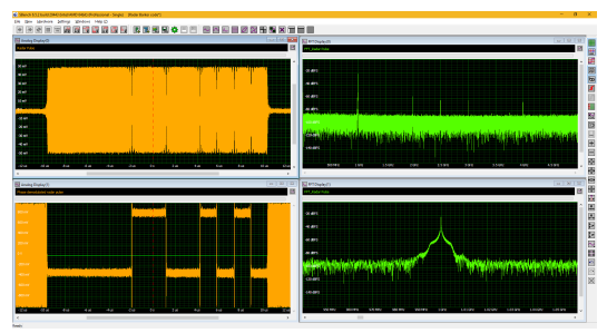 The acquired RF carrier was demodulated externally to SBench 6, using proprietary vector signal analysis software, and then the resultant in-phase and quadrature components are re-imported back into SBench 6 for additional analysis and display. Figure 3 provides an example of the results. The I component is shown in the upper left trace, the Q component is shown below the I component.