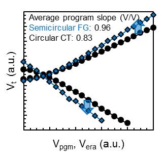 The experimental programme/erase characteristics in Figure 2 below, reveal that the semicircular FG cells with the high-k-based BLK exhibit significant gains in the program slope and program/erase window over the larger-sized circular CT cells.
