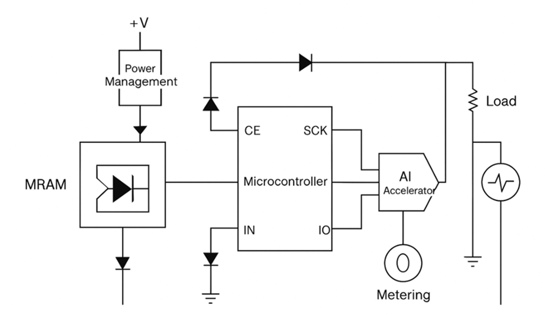 The architecture of an AI-enhanced smart meter integrating MRAM (Fig.1) is built around a modular embedded system comprising five principal components: a microcontroller unit (MCU), MRAM for non-volatile memory, an AI accelerator, a power management unit (PMU), and the metering/load interface. This configuration is designed to deliver high-performance, energy-efficient data acquisition, processing, and logging in Edge environments.