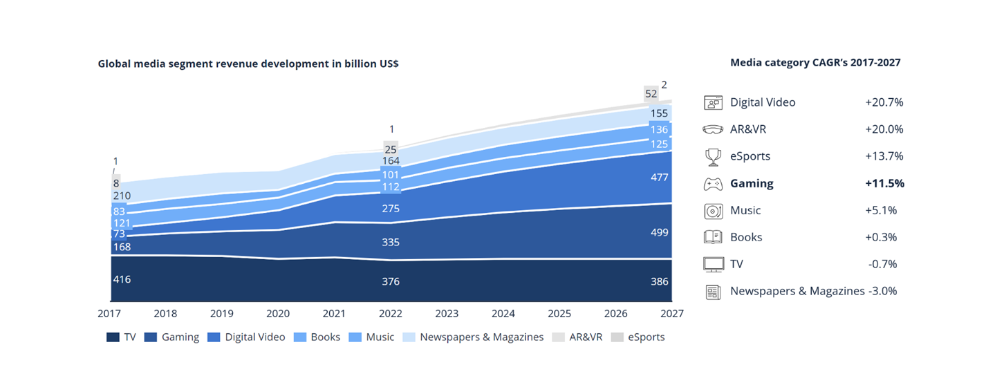 Even though many questions remain unanswered, it is already clear today that the potential is enormous – as shown in Chapter 5 of Statista’s Digital Economy Compass 2022. Gaming is already the strongest revenue-generating market in the digital media sector after TV. By 2027, Statista’s experts even expect it to grow further and become the strongest market at $499 billion. Digital video will move into second place ($477 billion) and TV will fall into third place ($386 billion). Thus, it appears that the development of the gaming market is already shaping a new digital economy.