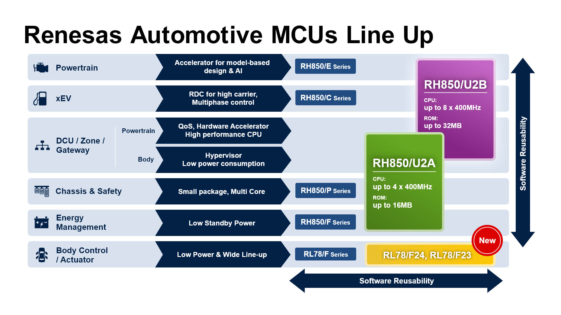 With the RL78/F24 and RL78/F23, Renesas expands its RL78 Family of low-power 16-bit MCUs and strengthens its broader automotive portfolio, offering customers highly reliable, high-performance solutions for systems ranging from actuators to zone control.