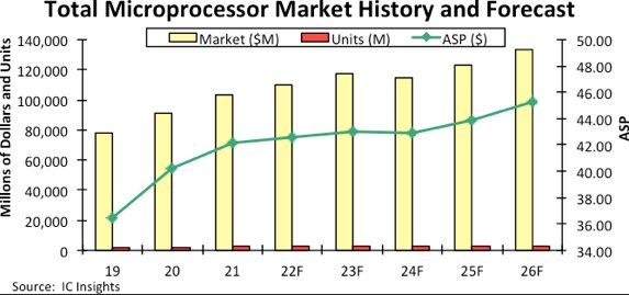 Embedded microprocessor sales for a broad range of end-use systems (including industrial, communications, automotive, and Internet of Things) are projected to grow 9% in 2022 to about $21.5 billion after increasing 11% in both 2021 and 2020. IC Insights’ McClean Report service forecasts total MPU sales to increase by a compound annual growth rate (CAGR) of 5.3% between 2021 and 2026 to $133.3 billion.