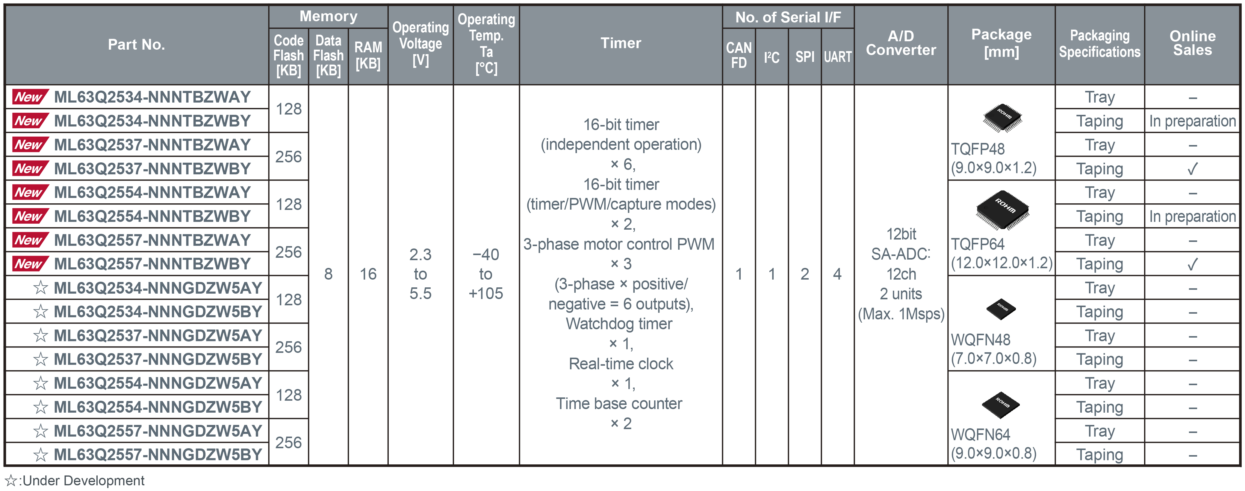 The lineup will consist of 16 products in different memory sizes, package types, pin counts, and packaging specifications. Mass production of 8 models in the TQFP package began sequentially in February 2025. Among these, two models with 256KB of Code Flash memory and taping packaging are available for purchase, along with an MCU evaluation board, through online distributors.