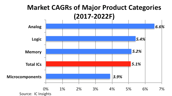 The 2018 McClean Report separates the total IC market into four major product categories: analogue, logic, memory, and microcomponents. Figure 1 shows the forecasted 2017-2022 CAGRs of these product categories compared to the projected total IC market annual growth rate of 5.1% during the five-year period.