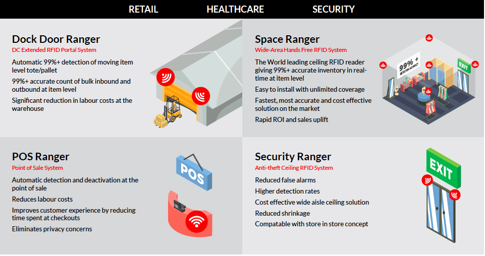 All four product groups deliver 99%+ detection rates for passive RFID tags even when these are distributed over wide areas and in high tag density environments. The products can be used for real time tracking of inventory, assets and people, delivering detailed sales visibility and insight, and ensuring better customer service, improved security and lower costs to businesses.