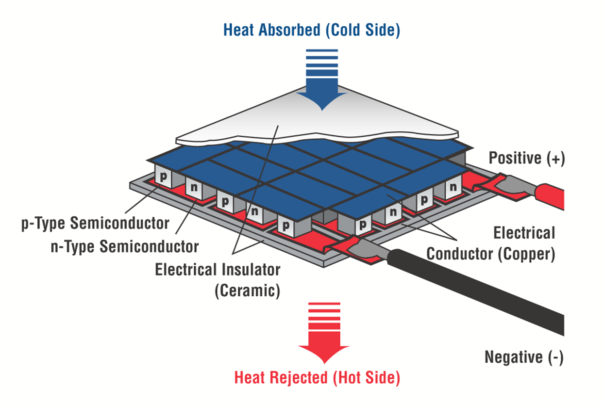 As a result, a small heat pump is formed that removes heat from the control side to the hot side. It is commonly referred to as the Peltier effect. Ceramic substrates are used for heat spreading and electrical isolation to pass thru current on each P and N junction element. A TEM can be as small as 2x2mm, allowing it to operate in tight space constraints. Below is a schematic of a TEM.