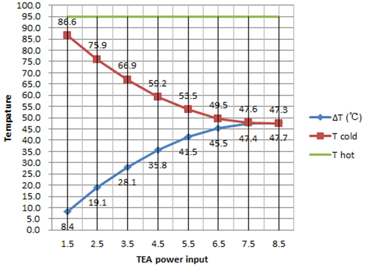 This test was repeated using an ATC designed to cool a QSFP transceiver. The TEM configuration has been optimised to maximise COP. A typical active heat load for a QSFP transceiver is 7.5W. The input power to TEM was gradually increased until the desired control temperature on optical transceiver was achieved. At an input power of 4.5W, the temperature of the optical transceiver was reduced to a target temperature of 70°C. This temperature could be further reduced by increasing the power to the TEM as shown in Figure 6.