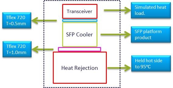 To validate the functional performance of an ATC Cooler, Laird simulated a test setup, as shown in Figure 4, to test the system design under various conditions dependent on the heat load generated for a typical SFP, XFP or QSFP transceiver.