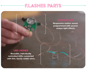 Available in seven colours, the f.lashes light up in various patterns and effects in response to different movements and motions, for example some light up when you jump and some move faster when you tilt or nod.