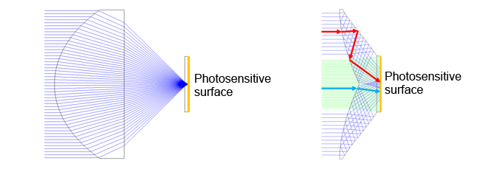 Comparison of light collection between a standard lens (left) and the newly developed lens (right)