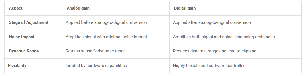 The noise introduced at this stage is relatively minimal since the signal is amplified before digital conversion. Also, it retains the sensor’s inherent signal-to-noise ratio (SNR), producing images with less graininess compared to digital gain.