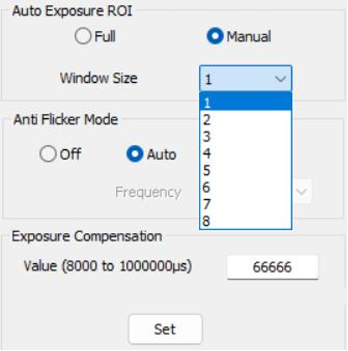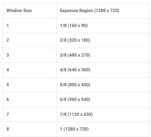 For frame size 1280×720, the exposure region based on the window size is listed in below table.