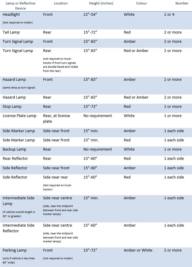 The following table lists the mandatory automotive lighting required to be installed on all vehicles with specifications of installations.