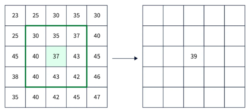The kernel window will be placed above the image pixel being processed (i.e., slide the kernel across each data point in the image). The average of the data points in the image matrix under the kernel window is calculated. The current data point in the image pixel is replaced with the calculated average. This process is repeated for every data point in the image.