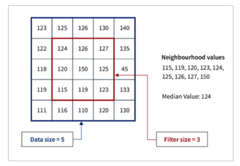 Just as in other filtering techniques discussed above, in a Median filter, a kernel matrix is slid over the entire image. Move the selected window over each pixel in the image, covering one pixel at a time. For each window placement, collect the pixel values within the window and sort them in ascending order. The median is the middle value in the sorted list. Assign the median value as the new value for the pixel at the centre of the window. This process is repeated for every pixel in the image.