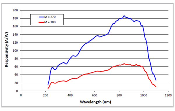 LASER COMPONENTS has developed an extremely thin P+ deposition layer, which minimises recombination and enables extremely high sensitivity to short wavelength light to be achieved.  An anti-reflection coating can also be applied with thickness tuned for minimum reflection of specific wavelengths. The company’s standard UV optimised SUR series APD offers the following spectral response: