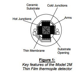 In the typical internal construction of a thermopile device produced by Dexter, the detector consists of a thermocouple array mounted on a ceramic substrate. The hot and cold junctions that form the thermocouple are connected with alternating n and p-type materials called ‘arms’. The cold junctions are thermally connected to the detector housing and are located around the perimeter of the substrate opening.