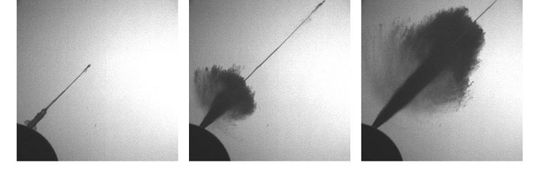 The use of the Kirana ultra-high-speed camera not only reduced the measurement time by several orders of magnitude but also provided information about the temporal course of the highly turbulent flow that have not been accessible before. In the Diesel fuel injection experiments, the transition from throttled pre-jet to full needle lift is clearly visible.