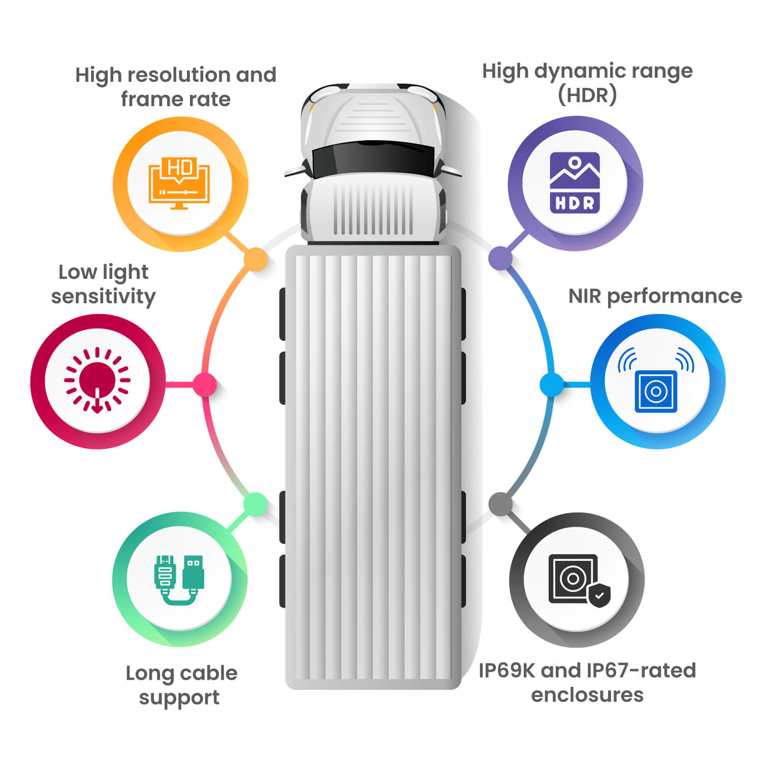 High resolution and frame rate: fleet management requires high-resolution imaging along with fast frame rates, especially for fast-moving vehicles. High resolution improves object boundary clarity, while higher frame rates reduce motion blur