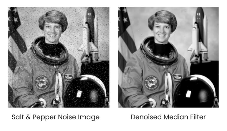 - Median filter (salt and pepper noise): a median filter removes salt and pepper noise by replacing each pixel’s value with the median of its neighbouring pixels