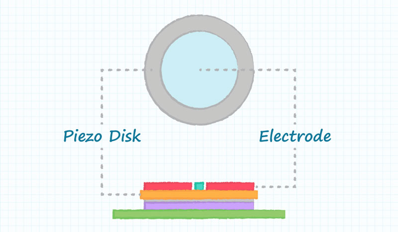 Figure 2 shows the elements of a piezo buzzer. A disk of piezoelectric material is supported at the edges in an enclosure and electrical contacts are fabricated on the two sides of the disk. A voltage applied across these electrodes causes the piezoelectric material to deform, resulting in the movement of air that can be detected as sound.