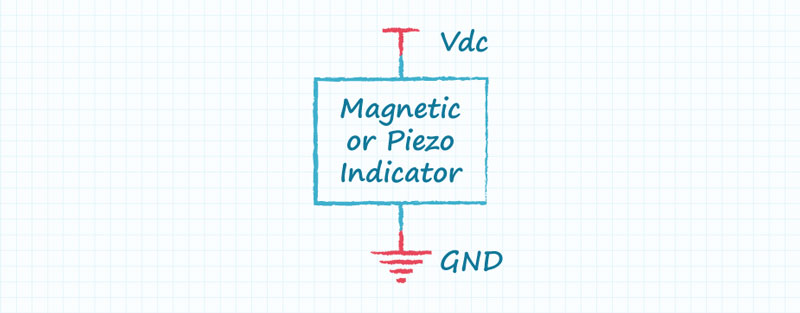 An indicator comes with driving circuitry built into the device. This simplifies circuit design (figure 3), enabling a plug-and-play approach, in exchange for reduced flexibility. While you only need to apply a dc voltage, one can only get a continuous or pulsed audio signal since the frequency is fixed internally. This means that multi-frequency sounds such as sirens or chimes are not possible with indicator buzzers.